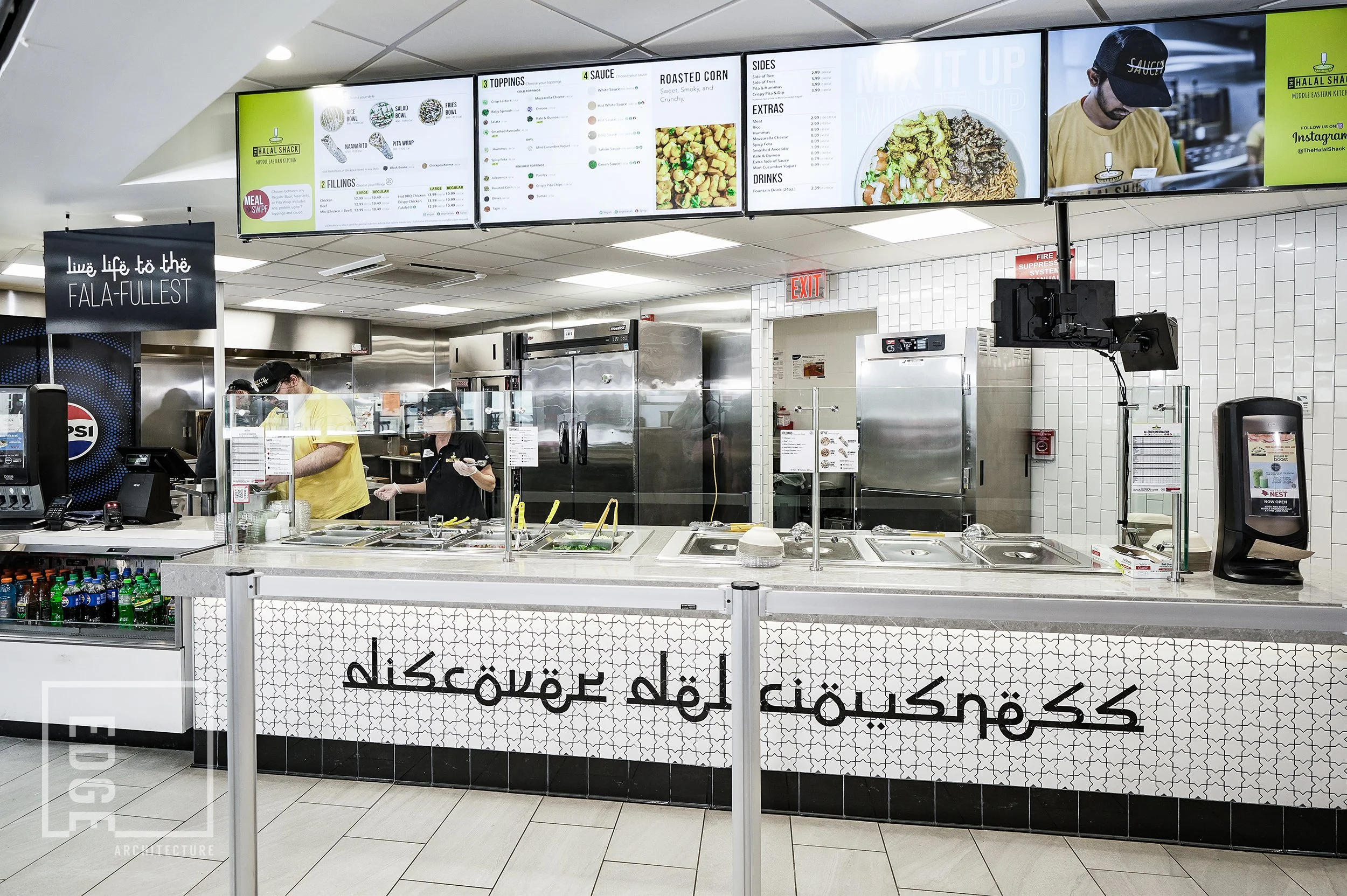 Diagonal design helps better manage the queue line and provide ample counter space for the servery as part of an open kitchen concept. Branding and signage for Halal Shack were important design elements.