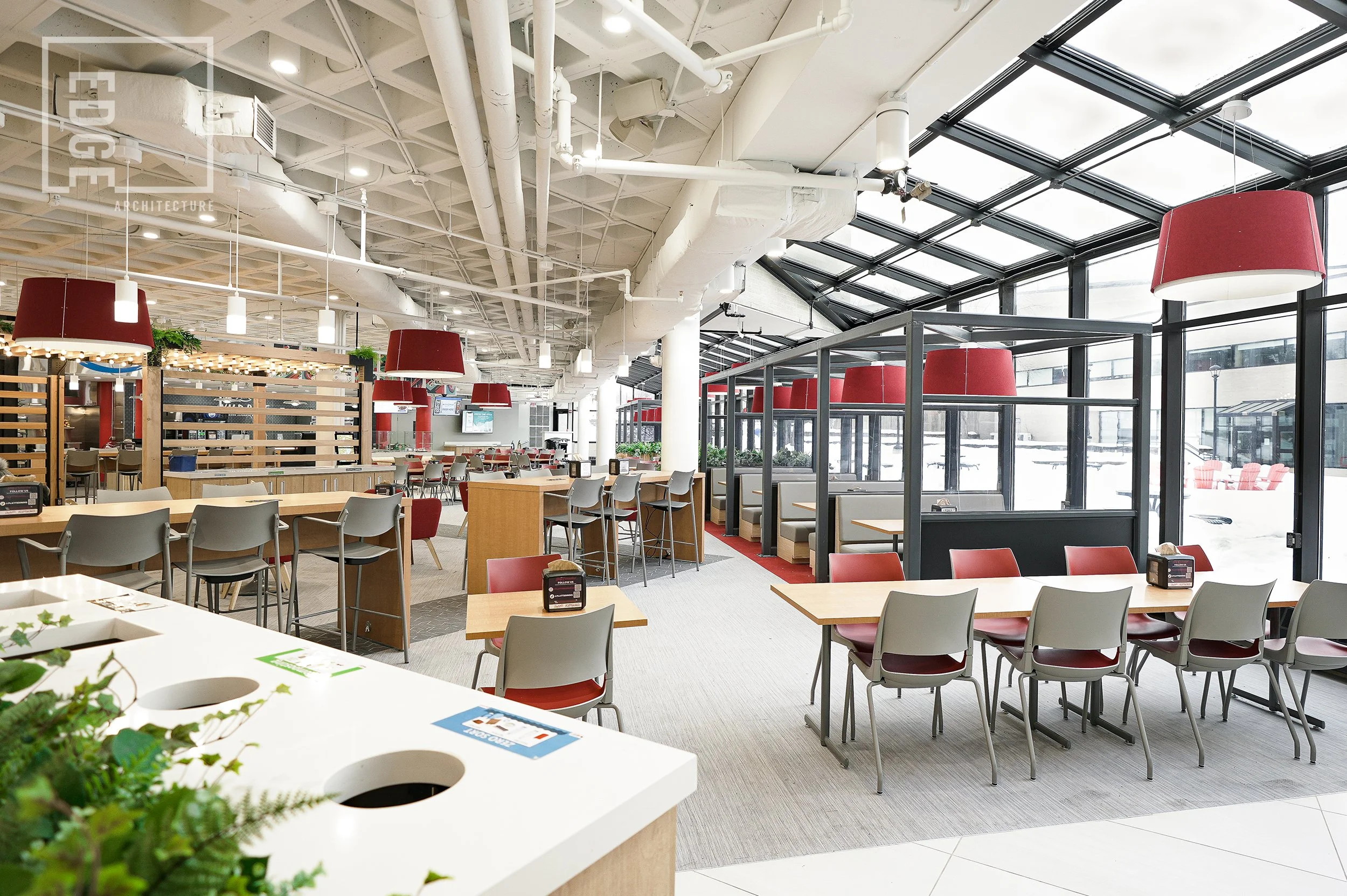 The dining area was redesigned to create a restaurant-like experience, using a mix of seating zones to engage multi-purpose use, and a welcoming lounge area with a new fireplace.