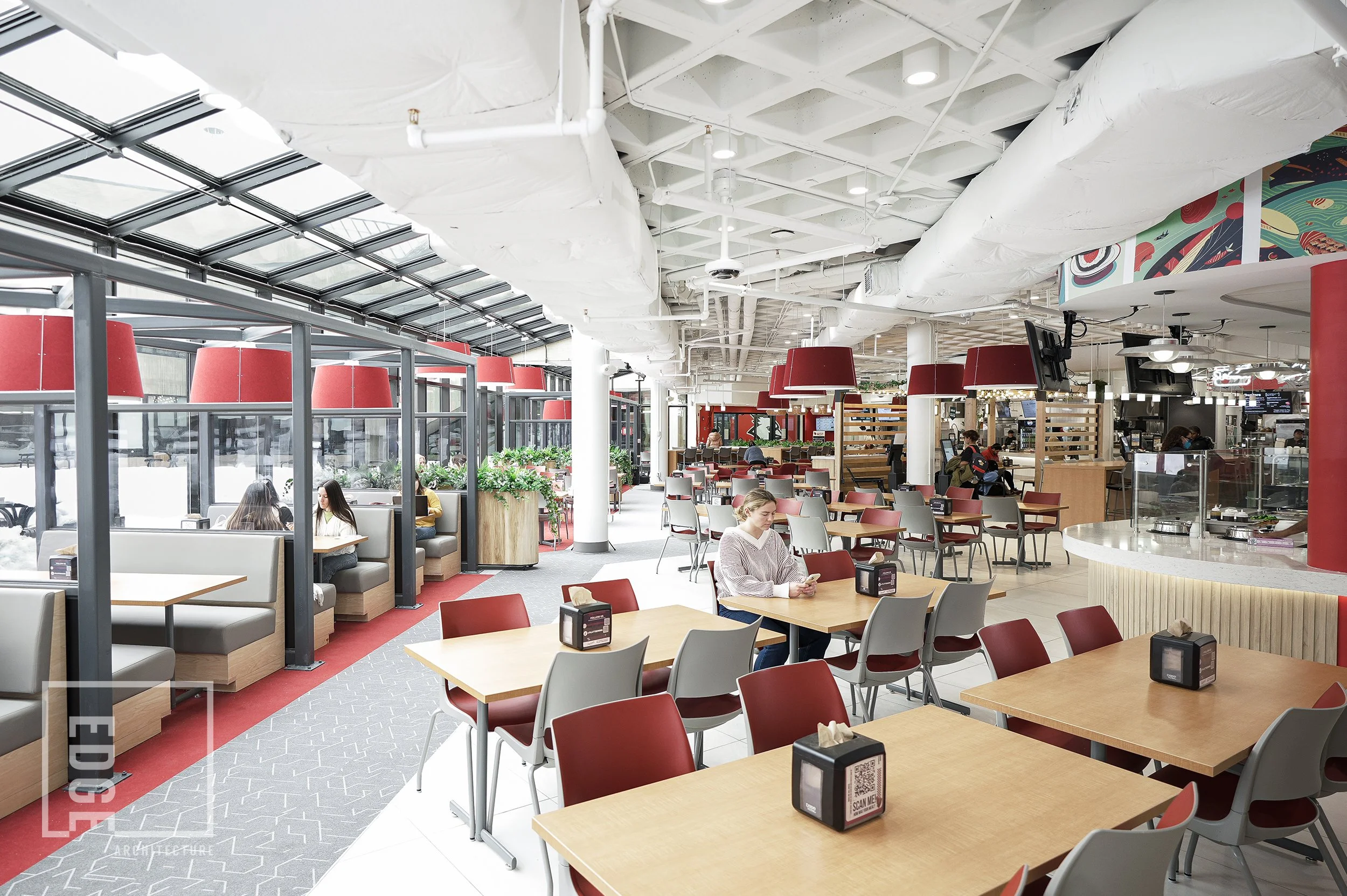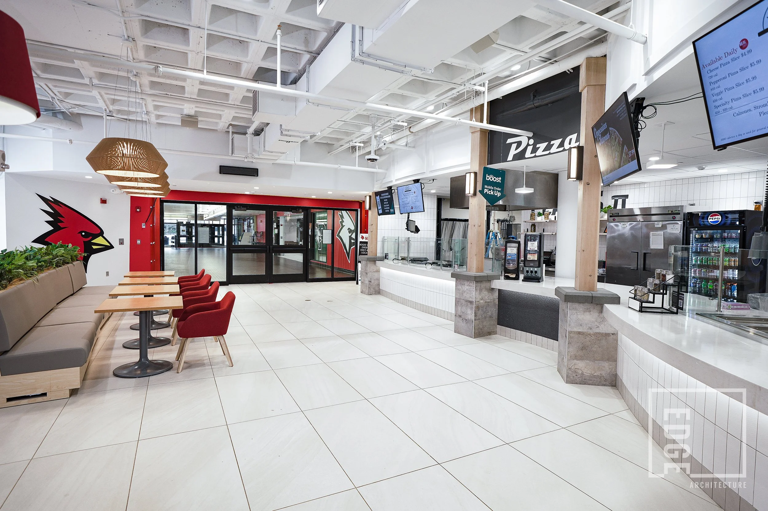 Edge Architecture transformed key areas of the campus student center to enhance dining and retail experiences for students and visitors. The project included a full renovation of approximately 10,000 square feet to create a vibrant new Food Hall featuring six distinct food service concepts and seating for 230 guests. Durable and cleanable design elements include stainless steel, quartz, tile, and furniture fabrics. Spacial zones were created using lighting, furniture applications, and pergola. Acoustical considerations for a comfortable environment were achieved through lighting selection, ceiling applications, and other finish materials. The existing convenience store was reimagined as a Compass-branded “Market” with digital checkout for increased efficiency. A freestanding “We Proudly Serve Starbucks” café and bakery was seamlessly integrated into the design, providing a popular spot for coffee and pastries. Additionally, Edge Architecture completed a separate gut renovation to establish a secondary dining location for The Halal Shack within the student center.