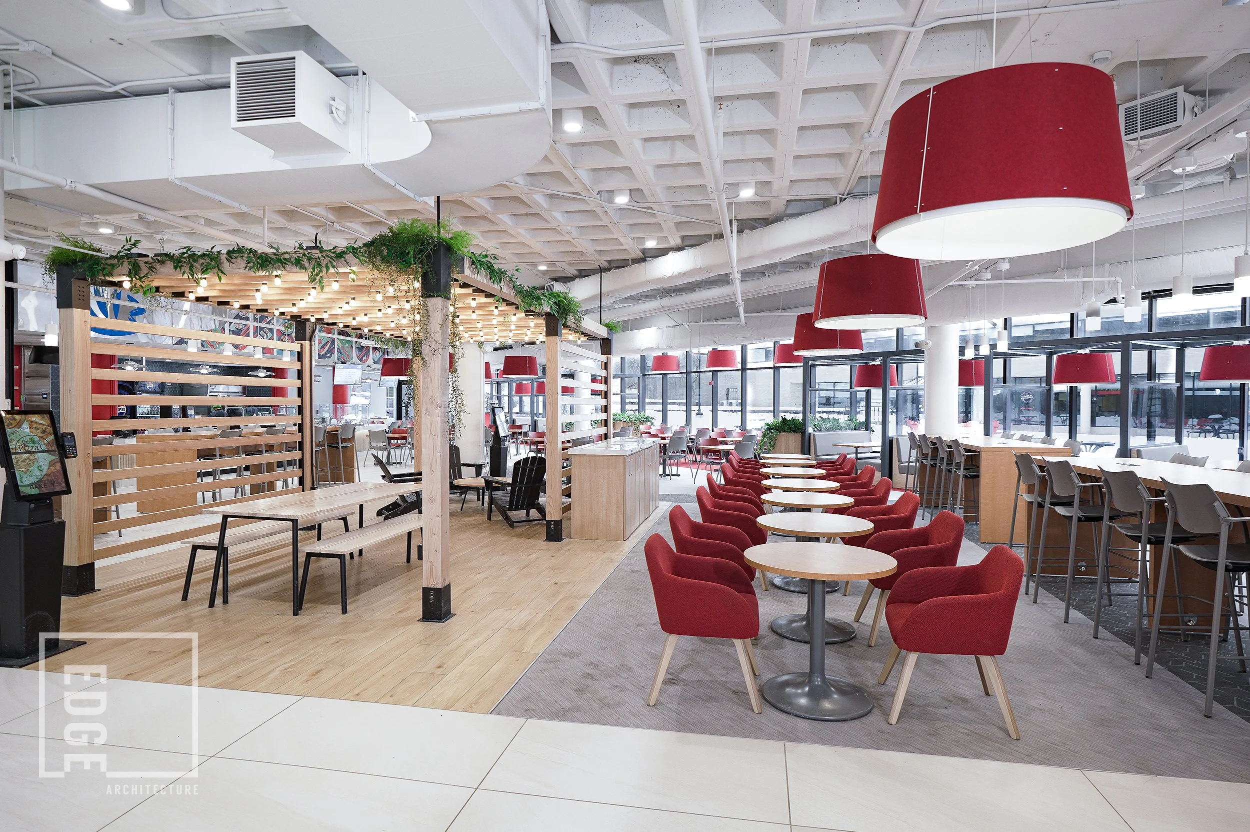 Original “basement-like” spaces were transformed to incorporate a modern the look with a retail ambiance, through interactive service stations, and flexible cooking equipment.