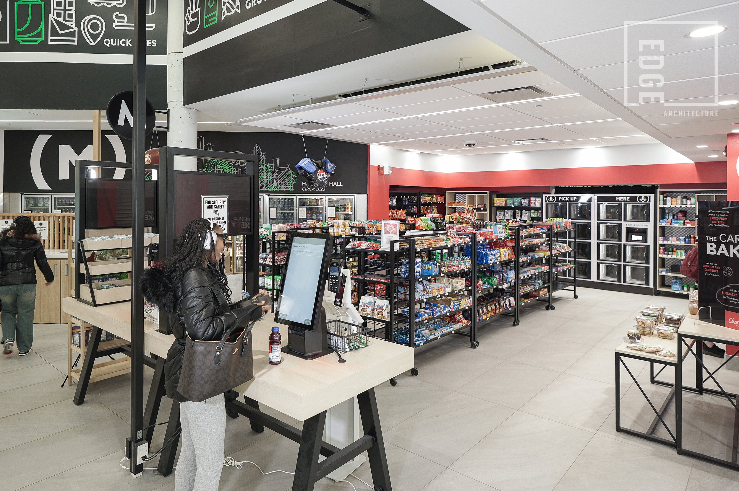 Convenience store offers self-checkout and food lockers to pick up orders from the Nest. Wide aisles make the store accessible, open layout offers visibility for security.