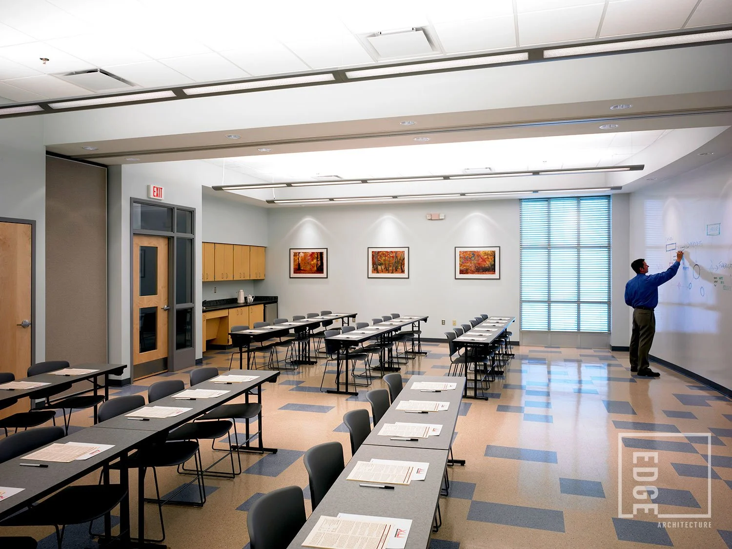 With a “full wall” whiteboard and modern design elements, the training room provides an environment conducive to concentration and focus, while avoiding distraction.